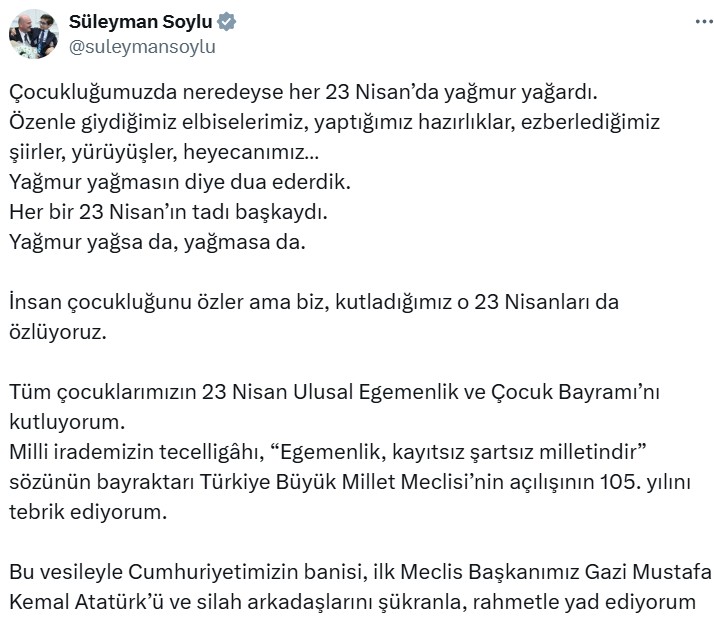 Paylaşımında “Çocukluğumuzda neredeyse her 23 Nisan’da yağmur yağardı” diyen Soylu, devamında şu satırları yazdı: