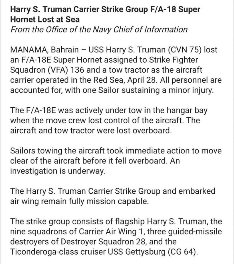 ABD Donanması, Kızıldeniz’de bulunan USS Harry S. Truman uçak gemisinden F/A-18E Muhteşem Hornet savaş uçağı ile birlikte bir çekicinin denize düştüğünü açıkladı.