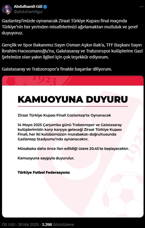 AKP Küme Başkanvekili ve Gaziantep Milletvekili Abdülhamit Gül, Gaziantep’te Trabzsonspor ve Galatasaray ortasında oynanacak olan Ziraat Türkiye Kupası final maçı için açıklama yaptı.