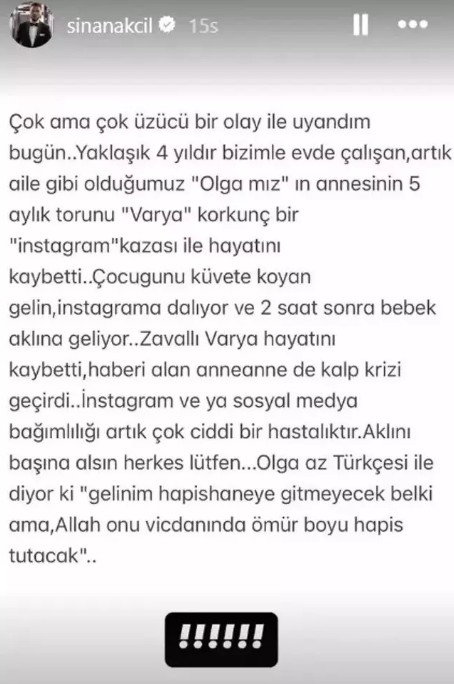 Ünlü müzikçi Sinan Akçıl, bugün Instagram hesabından yaptığı paylaşımla herkesi yasa boğdu. Sanatçı, uzun müddettir ailesi üzere yakın çalıştığı yardımcısı Olga’nın yaşadığı trajik olayı anlatarak toplumsal medya bağımlılığına dikkat çekti.