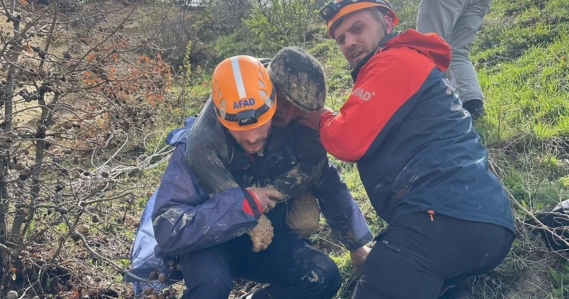 AFAD grupları, çamura saplanan Ünsal’ı ve ineğini kurtardı.