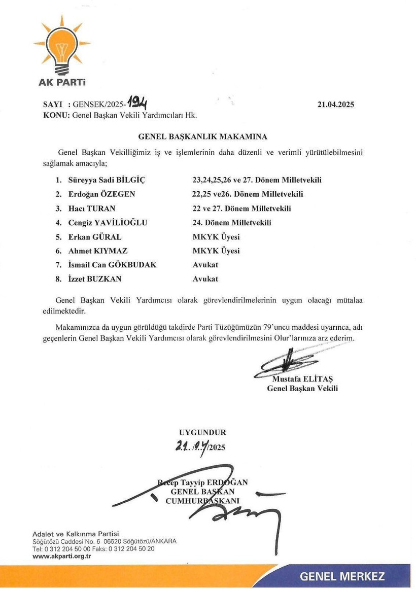 AKP’de Şubat ayında gerçekleştirilen 8. Olağan Büyük Kongre’nin akabinde yine Genel Lider Vekili olarak misyona getirilen Mustafa Elitaş’a, Cumhurbaşkanı Recep Tayyip Erdoğan’ın imzasıyla tam 8 isim yardımcı olarak atandı.