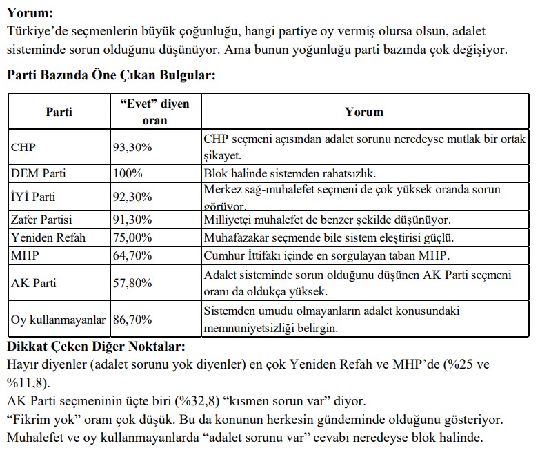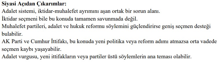 İktidar Koalisyonu: AKP ve MHP seçmenlerinde daha düşük lakin kritik düzeyde olan oranlar, adalet sıkıntısı iktidarın en zayıf halkası olarak görülüyor. Raporda seçmen sadakati üzerinde aşındırıcı tesiri olabileceği vurgulandı.