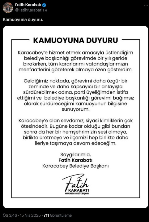 Fatih Karabatı, yaptığı açıklamada, “Karacabey’e hizmet etmek maksadıyla üstlendiğim belediye başkanlığı vazifemde bir yılı geride bırakırken, tüm kararlarımı vatandaşlarımızın menfaatlerini gözeterek almaya ihtimam gösterdim. Geldiğimiz noktada, misyonumu daha özgür bir yerde ve daha kapsayıcı bir anlayışla sürdürebilmek adına, parti üyeliğimden istifa ettiğimi ve belediye başkanlığı vazifemi bağımsız olarak sürdüreceğimi kamuoyunun bilgisine sunuyorum. Karacabey’e olan sevdamız, siyasi kimliklerin çok ötesindedir. Bugüne kadar olduğu üzere bundan sonra da her bir hemşehrimizin sesi olmaya, birlikte üretmeye ve ilçemizi daima birlikte daha ileriye taşımaya devam edeceğim.” tabirlerini kullandı. Karabatı, bu kararın akabinde belediye başkanlığı misyonunu bağımsız olarak yürüteceğinin altını çizdi.
