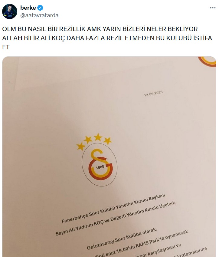 “Bu nasıl bir rezillik. Yarın (Galatasaray’ın şampiyonluk kutlamaları) bizleri neler bekliyor Allah bilir. Ali Koç daha fazla rezil etmeden bu kulübü, istifa et.”