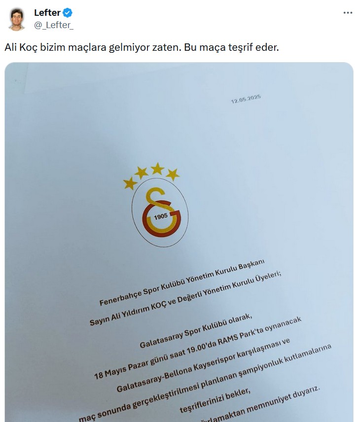 “Fenerbahçe Spor Kulübü İdare Heyeti Lideri Sayın Ali Yıldırım KOÇ ve Değerli Yönetim Kurulu Üyeleri; Galatasaray Spor Kulübü olarak, 18 Mayıs Pazar günü saat 19.00’da RAMS Park’ta oynanacak Galatasaray-Bellona Kayserispor müsabakası ve maç sonunda gerçekleştirilmesi planlanan şampiyonluk kutlamalarına teşriflerinizi bekler, Bu özel gecede sizleri ağırlamaktan memnuniyet duyarız.”