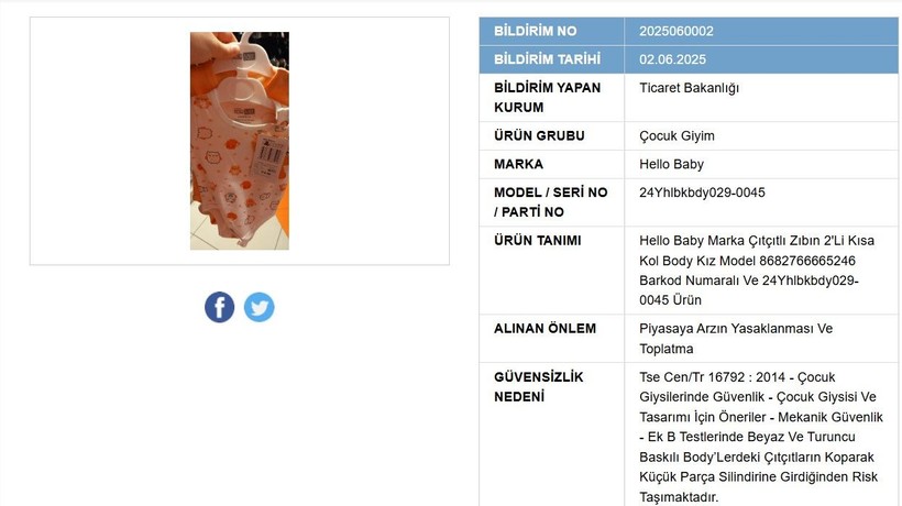 Daha evvel de Ebebek Mağazacılık Anonim Şirketi tarafından Türkiye’de üretilen Hello Baby markalı bir eserin risk taşıdığı belirtildi.