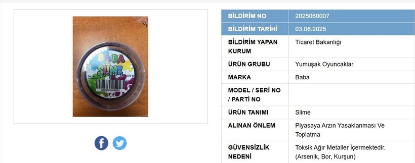 Baba marka yumuşak oyuncağın (slime) toksik ağır metaller içerdiği ve piyasadan toplatılma kararı verildi.