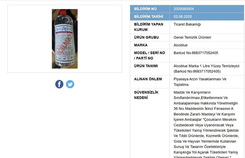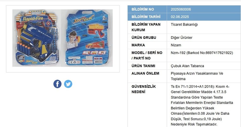 Bu kapsamda Ticaret Bakanlığı, Güvensiz Ürün Bilgi Sistemi’nde (GÜBİS) çocuk giysisi, oyuncak ve paklık gereçleri kategorisindeki birtakım eserler hakkında toplatılması istikametinde karar verdi.