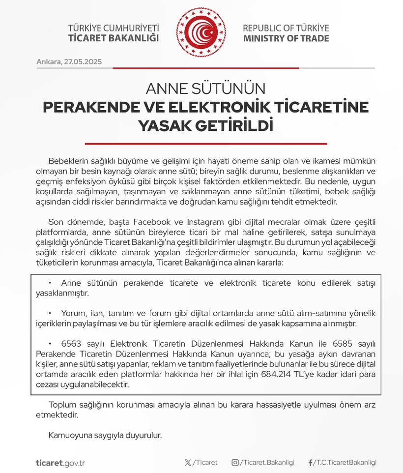 Sağlık riskleri dikkate alınarak yapılan değerlendirmeler sonucunda, kamu sıhhatinin ve tüketicilerin korunması emeliyle, Ticaret Bakanlığı’nca alınan kararla anne sütü satışı yasaklandı.