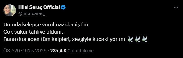 60 gün süren tutukluluğun akabinde bugün tahliye edilen astrolog Hilal Saraç, toplumsal medya hesabından yaptığı açıklamada şu sözlere yer verdi “Umuda kelepçe vurulmaz demiştim. Çok şükür tahliye oldum. Bana dua eden tüm kalpleri sevgiyle kucaklıyorum.”