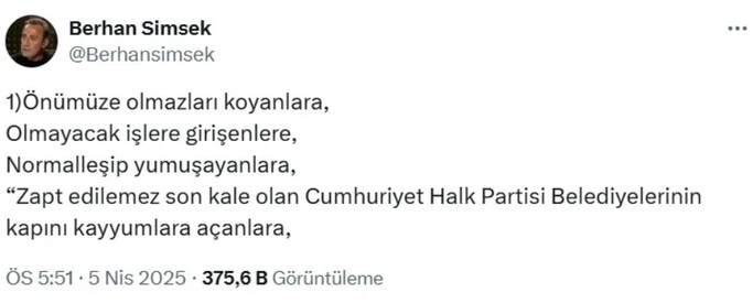 Halk TV muharriri Ayşenur Arslan, bugünkü ‘CHP’deki sivrisinekler!’ başlıklı yazısında dünkü CHP İnanılmaz Kurultayı’nda aday olmak isteyen ve CHP Genel Başkanı Özgür Özel ile tartışan CHP eski milletvekili Berhan Şimşek’ten bahsetti.