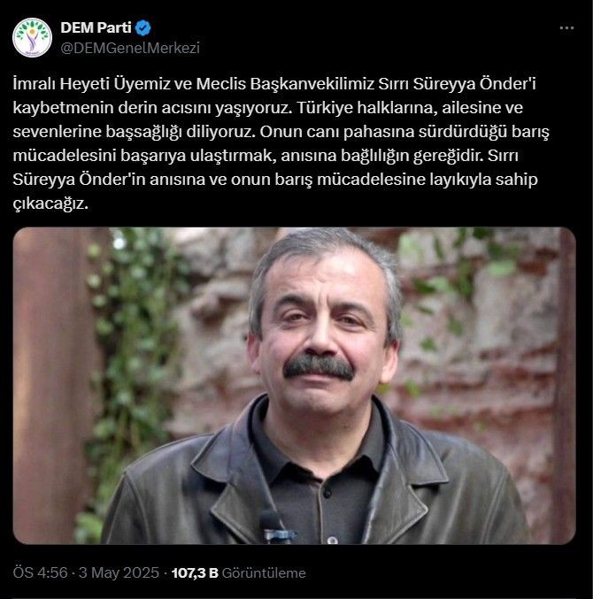 DEM Parti resmi X hesabından yapılan açıklamada, “Sırrı Süreyya Önder’in anısına ve onun barış çabasına layıkıyla sahip çıkacağız” denildi.