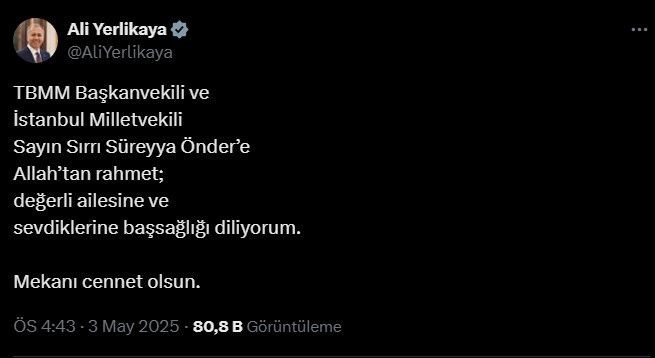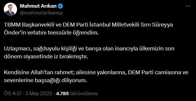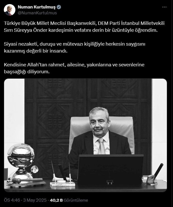 “Sanat ve siyaseti şahsında birleştirip buluşturan, sade hayatı ve sağduyulu vasfıyla halk nezdinde hürmet ve sevgiye müstahak olan TBMM Başkanvekili ve DEM Parti İstanbul Milletvekili Sayın Sırrı Süreyya Önder’i maalesef kaybettik. Sahiden çok üzgünüm. Farklı dünya görüşlerine sahip olsak bile birebir ülkenin barış ve huzur dolu geleceğine kilitlenmiştik. İnancım odur ki, terörsüz Türkiye’nin tezahürü Merhum Önder’e manevi bir armağan, ulusal birlik ve kardeşliğimize ebedi bir hizmet olacaktır. Sırrı Bey kardeşime Cenab-ı Allah’tan rahmetler niyaz ediyor, cennetiyle, cemaliyle ve merhametiyle mükafatlandırmasını diliyorum. Kederli ailesinin, DEM Parti topluluğunun, sevenlerinin ve seçmenlerinin, elbette hepimizin başı sağ olsun diyorum.”