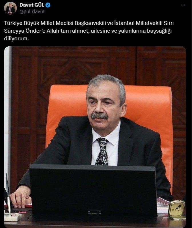 İstanbul Valisi Davut Gül’ün paylaşımında “Türkiye Büyük Millet Meclisi Başkanvekili ve İstanbul Milletvekili Sırrı Süreyya Önder’e Allah’tan rahmet, ailesine ve yakınlarına başsağlığı diliyorum” dedi.