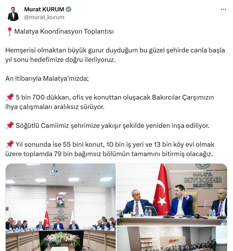X hesabından paylaşım yapan Bakan Murat Kurum, Hemşerisi olmaktan büyük gurur duyduğum bu hoş kentte canla başla yıl sonu gayemize yanlışsız ilerliyoruz” dedi.