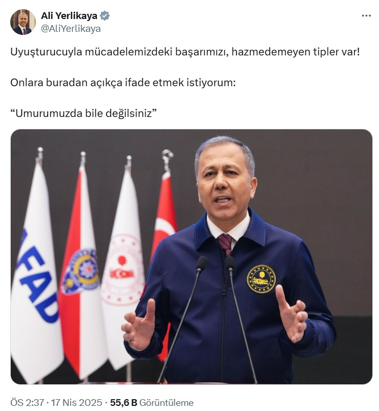Yerlikaya, X hesabından yaptığı paylaşımda ise “Uyuşturucuyla mücadelemizdeki başarımızı, hazmedemeyen tipler var! Onlara buradan açıkça söz etmek istiyorum: ‘Umurumuzda bile değilsiniz”