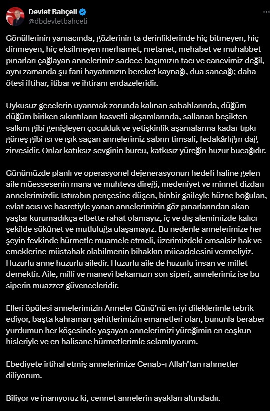 MHP lideri Devlet Bahçeli ise yaptığı paylaşımda aile vurgusunu kullanarak, Günümüzde planlı ve operasyonel dejenerasyonun amacı haline gelen aile kurumun mana ve muhteva direği, medeniyet ve minnet dizdarı annelerimizdir. Istırabın pençesine düşen, binbir gaileyle hüzne boğulan, evlat acısı ve hasretiyle yanan annelerimizin göz pınarlarından akan yaşlar kurumadıkça elbette rahat olamayız, iç ve dış alemimizde kalıcı biçimde sükûnet ve mutluluğa ulaşamayız.” dedi. Bahçeli, “Elleri öpülesi annelerimizin Anneler Günü’nü en yeterli dileklerimle tebrik ediyor, başta kahraman şehitlerimizin emanetleri olan, bununla birlikte yurdumun her köşesinde yaşayan annelerimizi yüreğimin en coşkun hisleriyle ve en halisane hürmetlerimle selamlıyorum. Ebediyete irtihal etmiş annelerimize Cenab-ı Allah’tan rahmetler diliyorum. Biliyor ve inanıyoruz ki, cennet annelerin ayakları altındadır” sözleri ile ‘Anneler Günü’nü tebrik etti.
