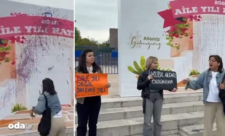 Sosyal medyada paylaştıkları imajlarda Halkevci Bayanlar üyesi olduğu belirtilen bir bayan, “Aile Yılı Hatırası” panosuna mor boya fırlattı. Ankara’daki Güvenpark’ta yaşanan olayda etraftakiler de alkışlarla bayanlara takviye verdi. Bayanlar, paylaşımda şu tabirleri kullandı: