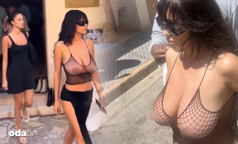 Bianca, spagetti askılı, derin yakalı, bedeni saran kesitli ve kısa paçalı transparan siyah file üstle görüldü. Bianca, güneş gözlükleri, kısa topuklu ayakkabılar ve gevşek saçlarla kombini tamamladı.