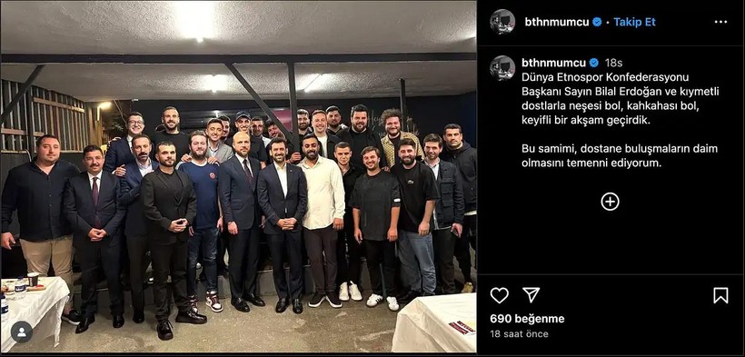 Kültür ve Turizm Bakanı Yardımcısı Batuhan Mumcu’nun fotoğrafı toplumsal medya hesabından paylaştı. Mumcu’nun paylaşımında “Dünya Etnospor Konfederasyonu Lideri Sayın Bilal Erdoğan ve değerli dostlarla sevinci bol, kahkahası bol, keyifli bir akşam geçirdik. Bu samimi, dostça buluşmaların daim olmasını temenni ediyorum” tabirlerini kullandı.