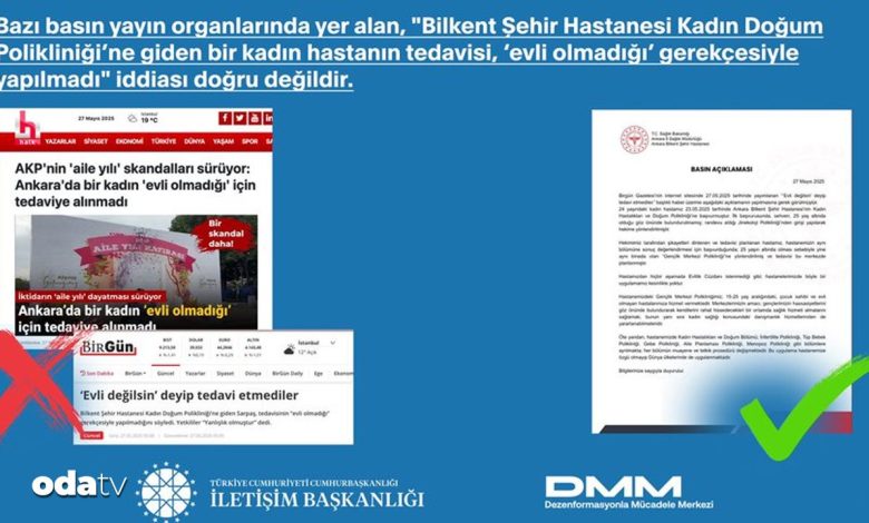 “Bazı basın yayın organlarında yer alan, “Bilkent Şehir Hastanesi Bayan Doğum Polikliniği’ne giden bir bayan hastanın tedavisi, ‘evli olmadığı’ gerekçesiyle yapılmadı” tezi gerçek değildir.
