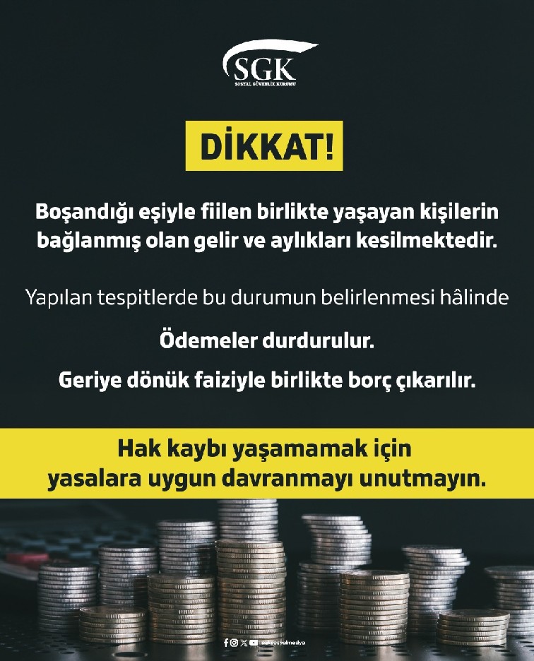 Sosyal Güvenlik Kurumu hileli boşanma yoluna başvuranlarla ilgili dikkat çeken bir paylaşım yaptı. SGK’dan yapılan paylaşımda “Dikkat! Boşandığı eşiyle fiilen birlikte yaşadığı tespit edilen şahıslara bağlanan aylıklar, kurumumuz tarafından yapılan tespitler doğrultusunda kesilmektedir. Hak kaybı yaşamamak için kanunlara uygun davranmayı unutmayın” uyarısı geldi.