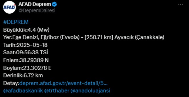 AFAD’ın bilgilerine göre, Ege Denizi Çanakkale Ayvacık açıkları Eğriboz Adası’nda, saat 09.56’da 4.4 büyüklüğünde sarsıntı meydana geldi. Sarsıntının derinliği 6.72 kilometre olarak ölçüldü.