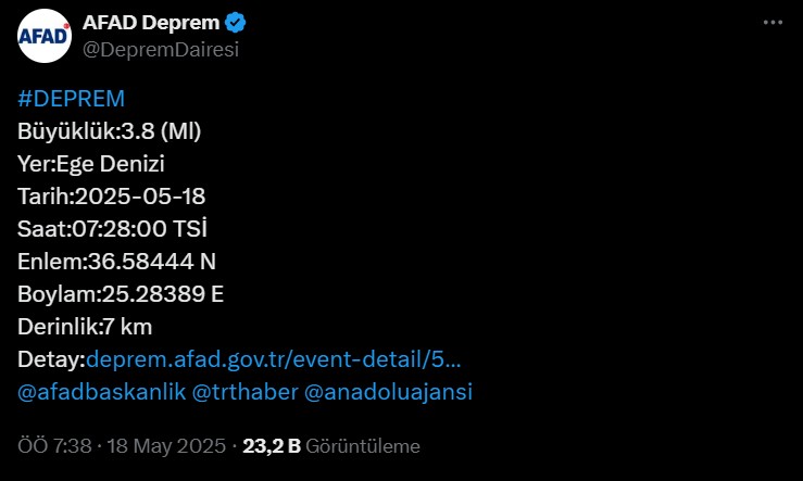 AFAD, sabah saat 07,28’de 3.8 büyüklüğünde bir zelzelenin olduğunu açıklamıştı.