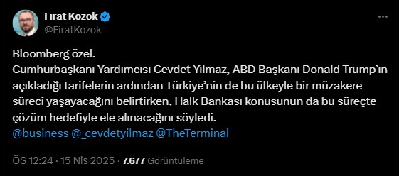 Bloomberg News’ten gazeteci Fırat Kozok, ABD’nin ekstra gümrük tarifeleriyle ilgili bir müzakere süreci yürütüleceğini ve bu süreçte Halk Bankası hakkında ABD’de devam eden davanın da müzakerelerde ele alınacağını aktardı.