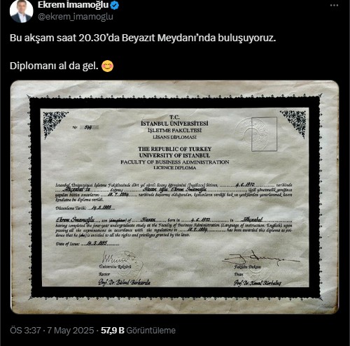 Bu akşam yapılacak miting için İBB Başkanı Ekrem İmamoğlu da toplumsal medya hesabından davette bulundu. İmamoğlu, “Bu akşam saat 20.30’da Beyazıt Meydanı’nda buluşuyoruz. Diplomanı al da gel” dedi.