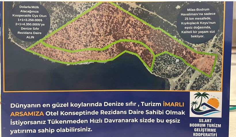 “Bodrum Turizm Geliştirme Kooperatifi” antetli kağıdın yanı sıra yayınlanan ilanda arazinin fotoğrafına da veriliyor.