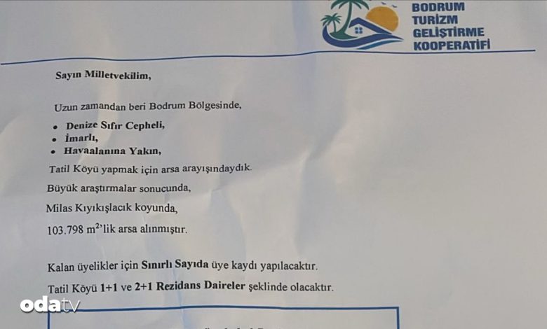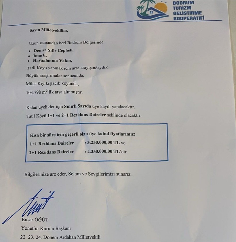 Meclis’teki milletvekillerine gönderilen yazıda, “103 bin metrekarelik arazi üzerinde 1+1 ve 2+1 bir rezidans tipinde daireler 3 milyon 250 bin TL ve 4 milyon 350 bin TL fiyatla satılık” tabirleri bulunuyor.
