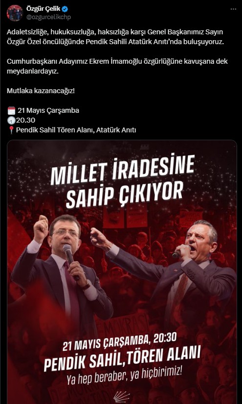 Miting, 21 Mayıs Çarşamba günü saat 20.30’da Atatürk Anıtı önünde başlayacak. CHP İstanbul İl Başkanı Özgür Çelik, sosyal medya üzerinden yaptığı açıklamada, “Adaletsizliğe, hukuksuzluğa ve siyasi baskılara karşı Genel Liderimiz Özgür Özel liderliğinde Pendik’teyiz. Tüm halkımızı bu manalı direnişe davet ediyoruz” sözlerini kullandı.