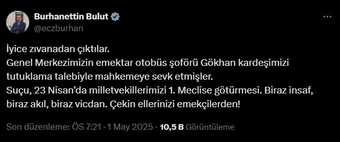 Suçu, 23 Nisan’da milletvekillerimizi 1. Meclise götürmesi. Biraz insaf, biraz akıl, biraz vicdan. Çekin ellerinizi emekçilerden!”
