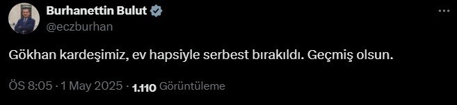 “Gökhan kardeşimiz, mesken hapsiyle özgür bırakıldı. Geçmiş olsun.”