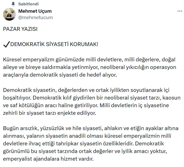 “Küresel emperyalizm günümüzde ulusal devletlere, ulusal kıymetlere, doğal aileye ve bireye saldırmakla yetinmiyor, neoliberal yıkıcılığın operasyon araçlarıyla demokratik siyaseti de maksat alıyor” diyen Uçum, “Demokratik siyasetin, bedellerden ve ortak uygunluktan soyutlanarak içi boşaltılıyor. Demokratik kılıf giydirilen bir neoliberal siyaset biçimi, kaosun ve saf berbatlığın aracı haline getiriliyor. Ulusal devletlerin iç siyasetine zehirli bir siyaset üslubu enjekte ediliyor” satırlarını kullandı.
