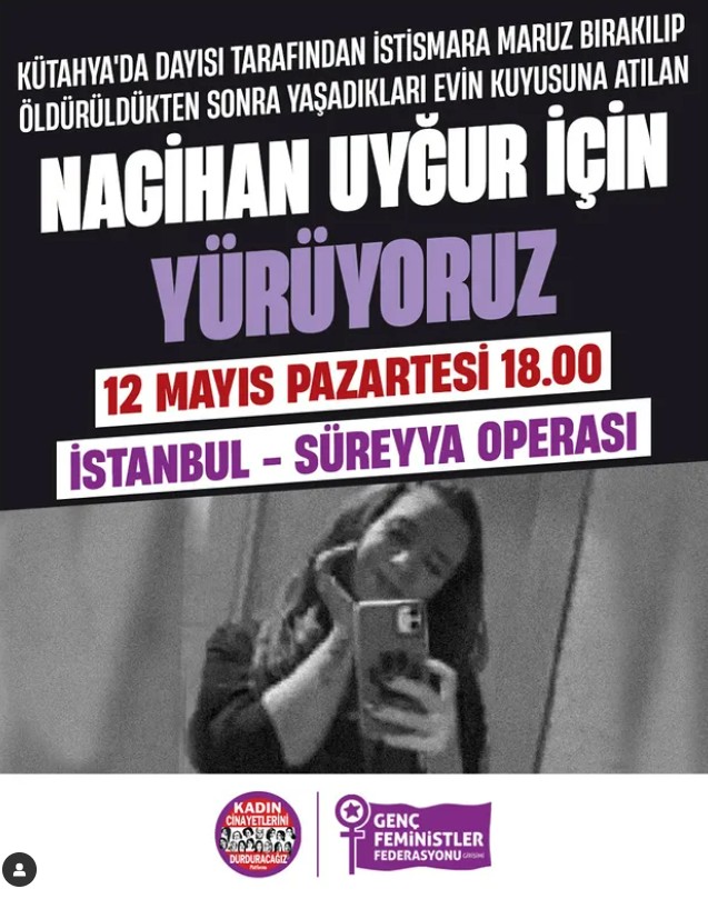 Yaşananların akabinde “Kadın Cinayetlerini Durduracağız” platformu, “Bir yıl evvel dayısı tarafından cinsel hücuma uğrayıp vahşice öldürülen ve meyyit vücudu yeni bulunan Nagihan Uyğur’un için yürüyoruz” diyerek davet yaptı. 12 Mayıs Pazartes, saat 18.00’da, Süreyya Operası önünden yürüyüş gerçekleştirilecek.