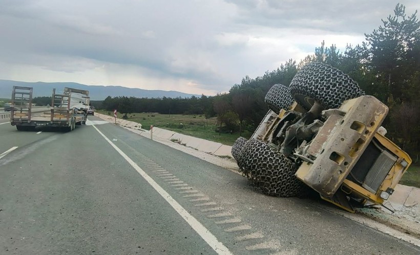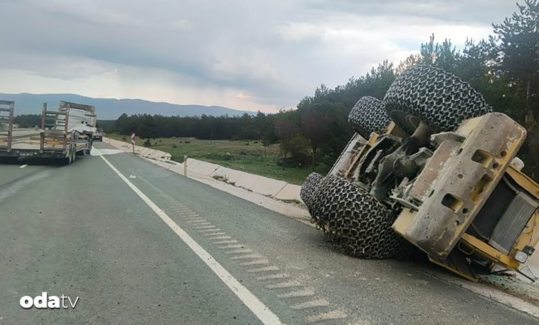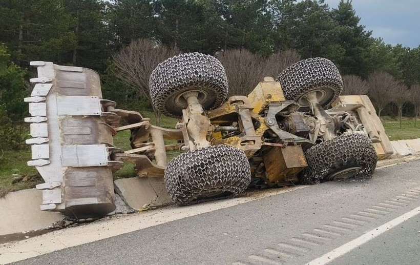 Kazada yaralanan olmazken devrilen iş makinesi ve duran tır nedeniyle trafik bir müddet denetimli olarak sağlandı.