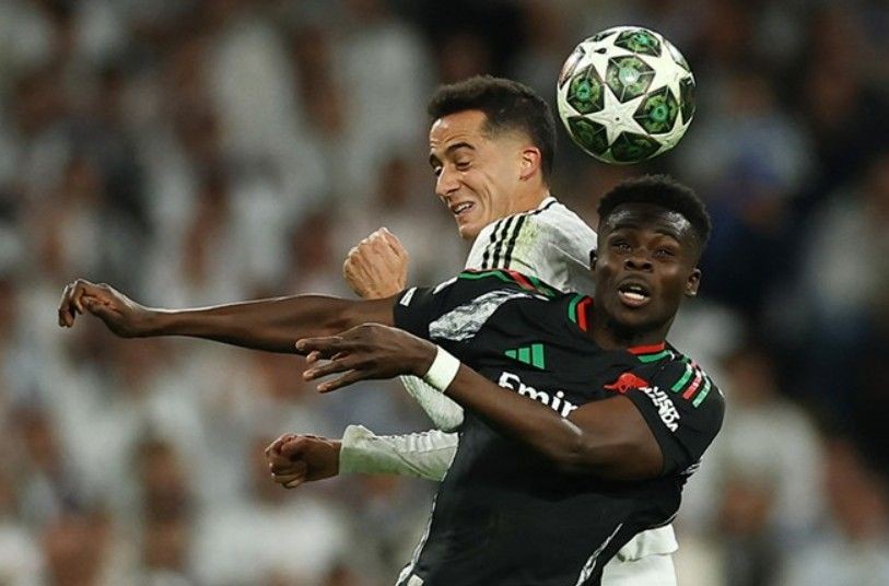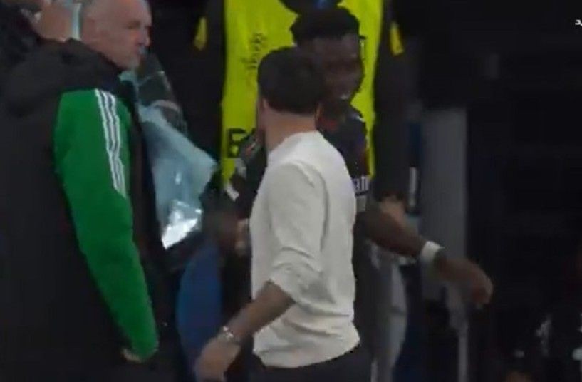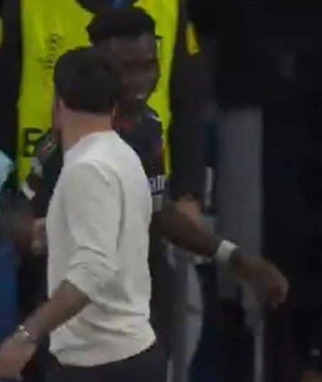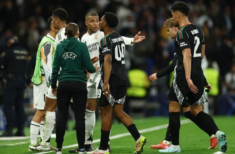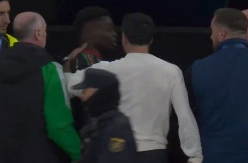 Real Madrid’in kaptanlarından Dani Carvajal sakatlığı nedeniyle maç takımında olmamasına karşın alana indi ve Saka’nın üzerine yürüdü.