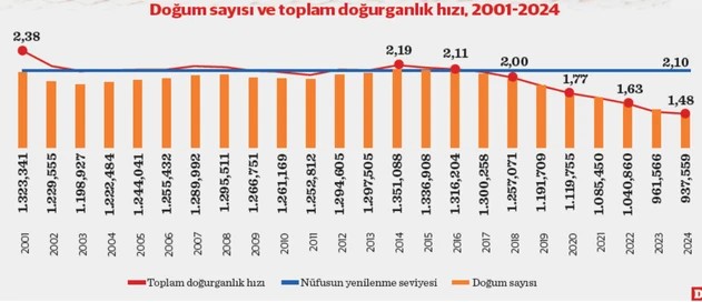 -Bin nüfus başına doğum sayısı kaba doğum hızı) 2001-2024 ortasında 20,3’ten 11’e indi.