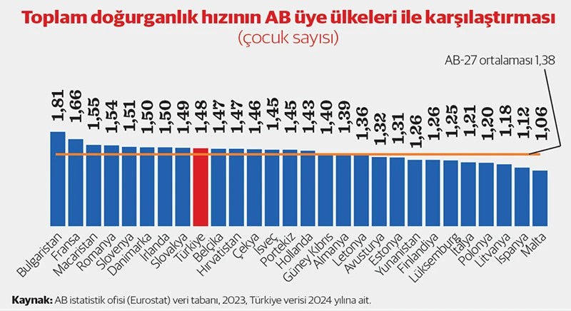 Toplam doğurganlık suratı, yaşlanan nüfus, iş gücü açığı, büyüyen toplumsal güvenlik maliyetleri üzere meselelerin öne çıktığı Avrupa Birliği (AB) üye ülkeleri ortalamasında 1,38 çocuk seviyesinde. Buna nazaran Türkiye, 2024 prestijiyle düşük doğurganlık suratında AB ortalamasına yaklaşmış bulunuyor. Lakin bu oran AB ülkeleri içinde de farklılık gösteriyor. AB üyesi 27 ülke içinde en yüksek toplam doğurganlık suratına 1,81 çocukla Bulgaristan sahip olurken, en düşük toplam doğurganlık suratına sahip ülke ise 1,06 çocukla Malta. Toplam doğurganlık suratında Türkiye, AB üyesi ülkelerle yapılan sıralamada 9’uncu durumda.