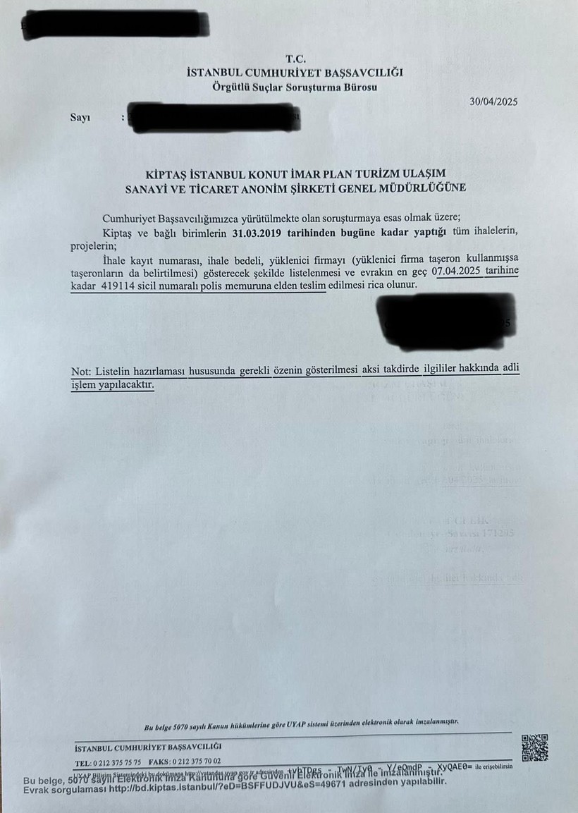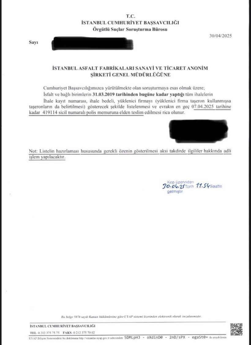İstanbul Cumhuriyet Başsavcılığı İBB’den talep ettiği dokümanları en geç 7 Mayıs 2025 yerine geçmiş bir tarih olan 7 Nisan 2025’e kadar talep etti.
