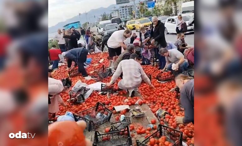Domates dolu tır devrildi: Vatandaş bu türlü topladı