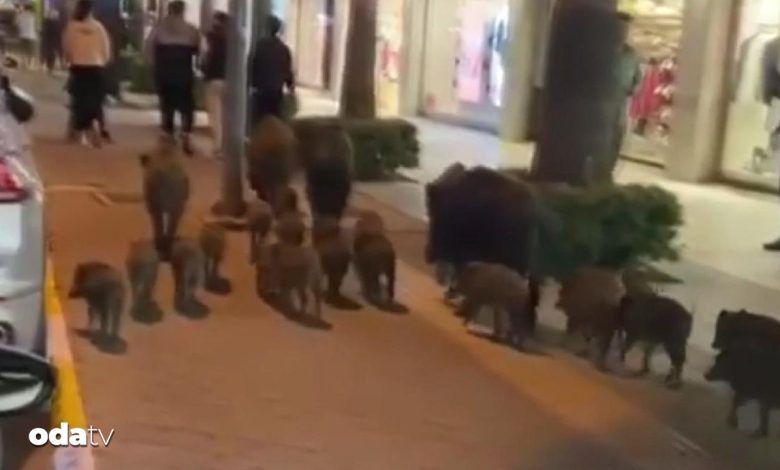 Ormanlık alandan çıktığı kestirim edilen domuz ve yavruları, Kuşadası ilçe merkezindeki Marina mevkisine kadar geldi.