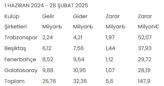 Dört kulüp şirketlerinin 1 Haziran 2024 ile 28 Şubat 2025 ortasındaki periyotta gelir/gider tablosu şöyle: