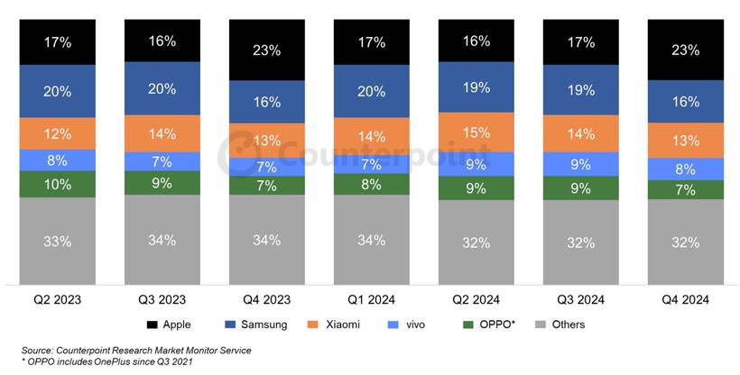 Apple’ı yüzde 18’lik pazar hissesi ile Samsung, yüzde 14’lük pazar hissesi ile Xiaomi, %yüzde 8’lik pazar hisseleri ile de vivo ve OPPO takip etti. Apple’ın satışları yüzde 4 artarken Samsung’un satışları ise yüzde 5 geriledi.