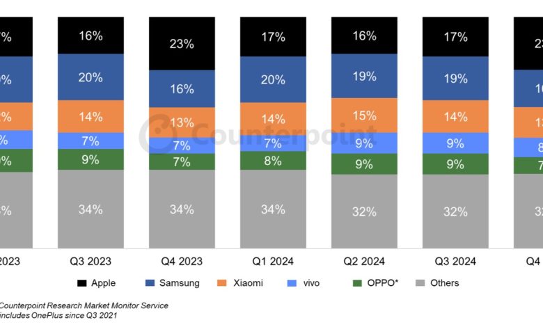 Counterpoint’e nazaran Apple, 2025’in birinci çeyreğinde en büyük rakibi Samsung’u geçerek yüzde 19 ile birinci sırada yer aldı.