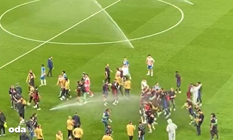 La Liga’da küme düşme çizgisinde bulunan ve sıkıntı günler geçiren Espanyol, Barcelona futbolcuları şampiyonluğun sevincini yaşarken fıskiyeleri açarak ezeli rakibinin şampiyonluk sevincini engellemeye çalıştı. Bu olay akıllara 12 Mayıs 2012 de Ülker Stadı’nda oynanan Fenerbahçe- Galatasaray maçını getirdi. Süper Lig’de uygulanan birinci ve tek play-off formatı olan Üstün Final’in son maçının bitiş düdüğü ile birlikte 0-0’lık beraberlik Galatasaray’ı şampiyon yaptı. 100 yıllık rekabetin en değerli derbilerinden birinin akabinde rakibinin stadında şampiyon olan Galatasaray kupa seremonisini Ülker Stadı’nın çimlerinde yapmak isteyince stadın ışıkları kapatıldı ve fıskiyeler açıldı. Galatasaray kupayı karanlık bir ortamda ve ıslak çimlerin üzerinde aldı.