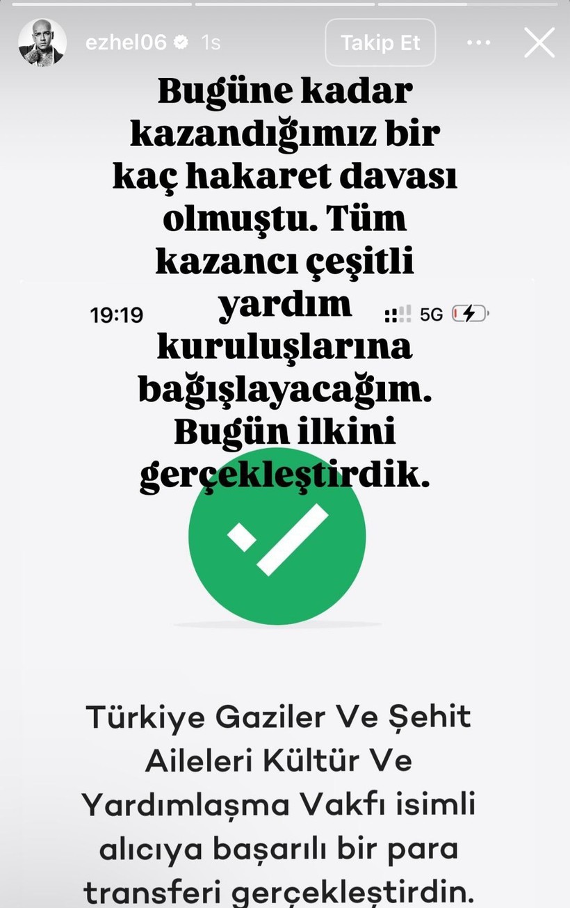 PKK’yı savunduğu gerekçesiyle birçok reaksiyonla karşılaşan Ezhel, yaptığı paylaşımda, “Bugüne kadar şahsıma yönelik açılan hakaret davaları sonucunda kazandığım tüm tazminatları Türkiye Gaziler ve Şehit Aileleri Vakfı’na bağışladım. Bu vesileyle tüm gazilerimize minnet ve şükranlarımı sunar, şehitlerimizi rahmetle anarım” sözlerini kullandı.